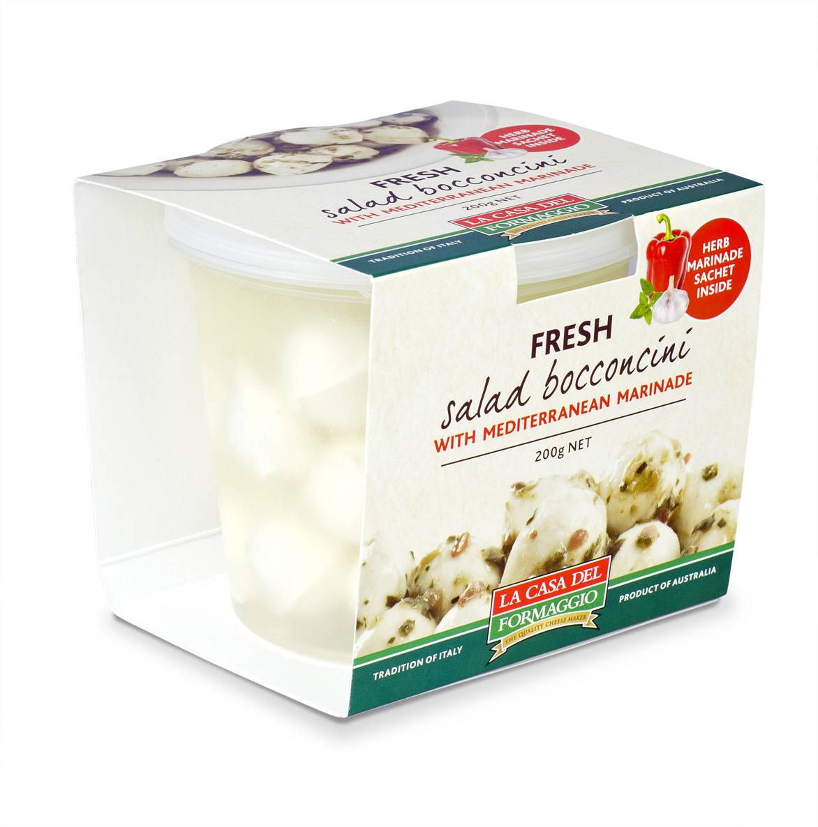 A completely new and novel product to the marketplace, La Casa Del Formaggio’s Fresh Salad Bocconcini with Mediterranean Marinade combines bocconcini in its freshest form (preserved in brine) with an herb marinade sachet placed on top of the lid from Queensland-based Gourmet Gardens. The consumer only needs to tip the brine, add the marinade and shake or stir to combine for instant antipasto or a flavourful addition to a salad or entrée. Salad Bocconcini are a fresher, healthier style of marinated cheese. The Mediterranean marinade consists of garlic, capsicum, basil and oregano. This product was launched with two companions: