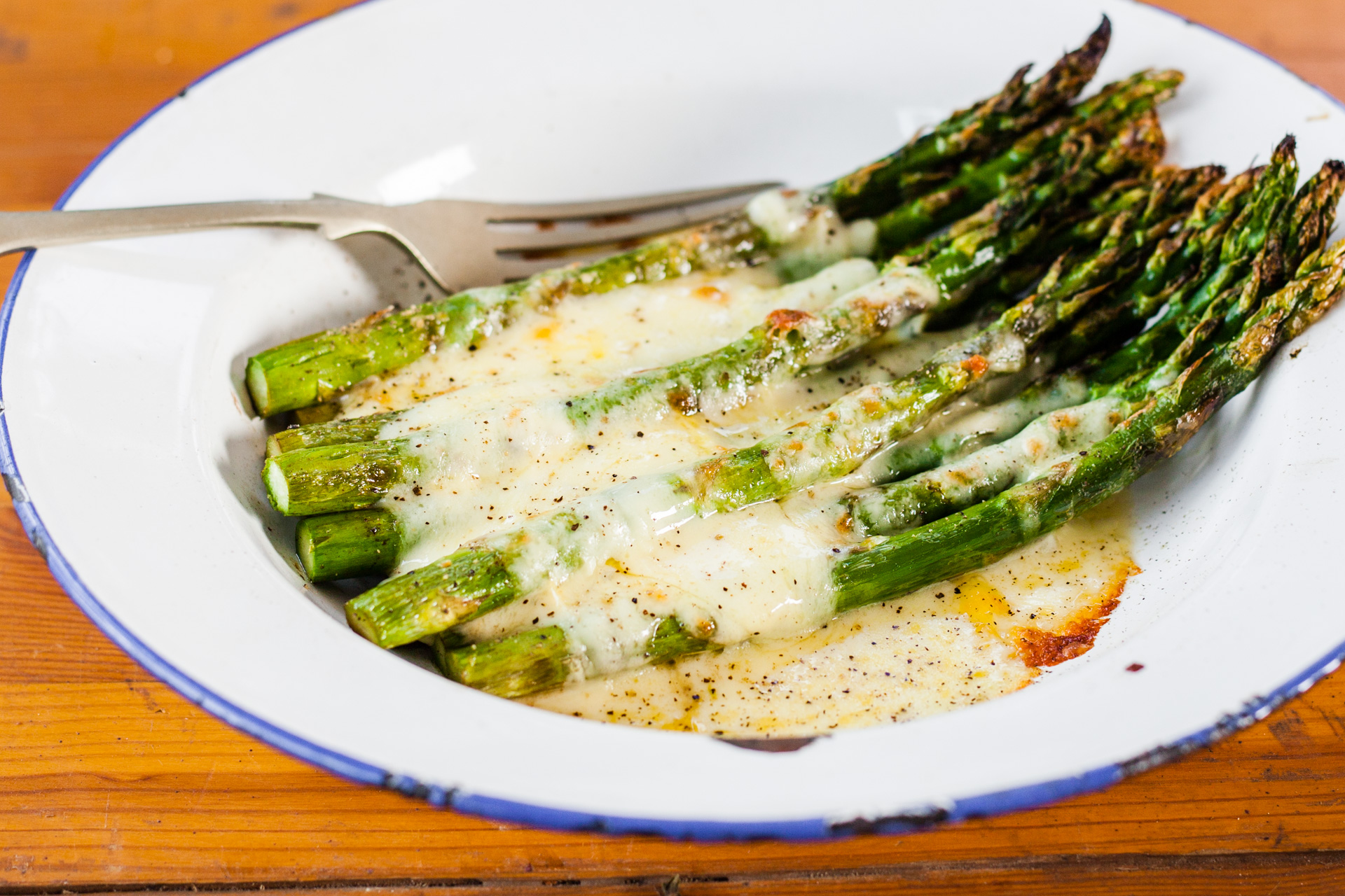 | 6 | Prepare a small baking dish. Place asparagus on the baking dish in a row, with sides touching. Grate a generous amount of Mozzarella over the top and chilli if desired. |